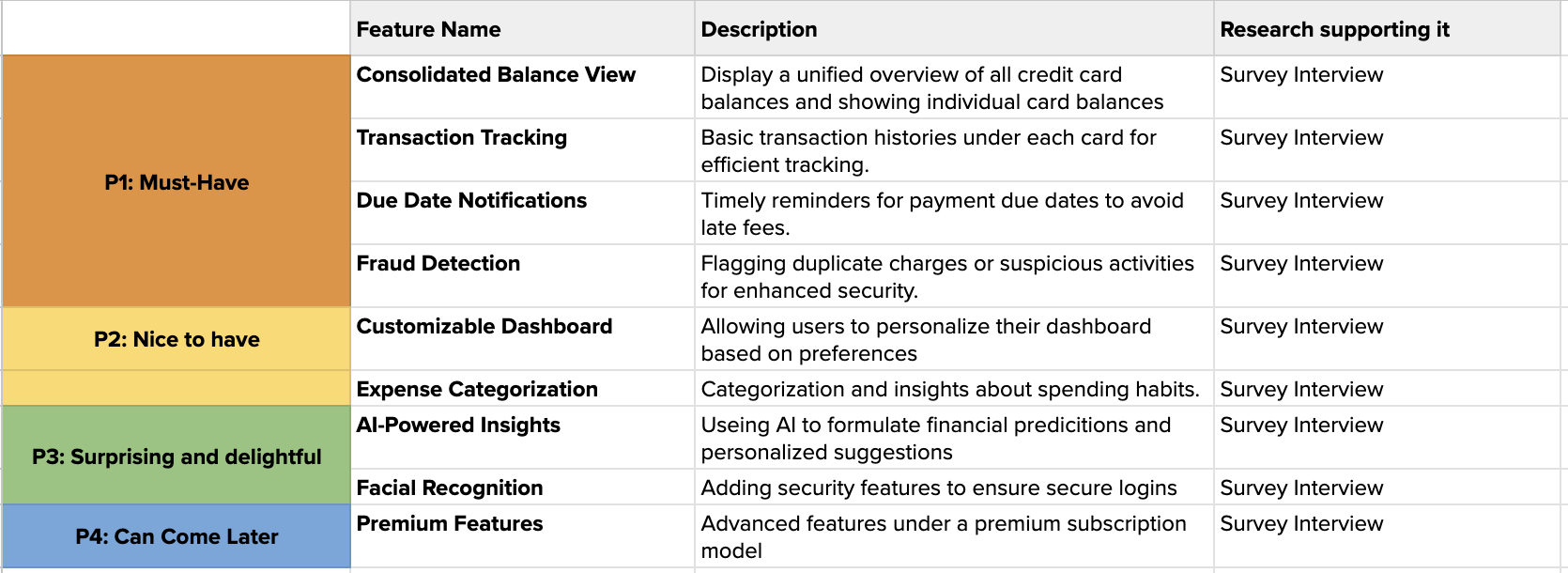 The features are categorized into what is necessary and what could be potentially added based on my user surveys and research. This serves as my checklist for prioritizing what I need to focus on and what can be added in the future.
