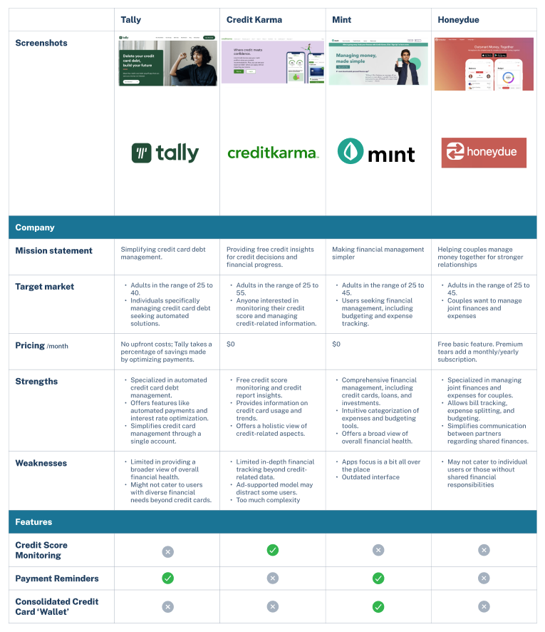 Through my findings, I was able to narrow down to analyzing Tally, Credit Karma, Mint, and Honeydue