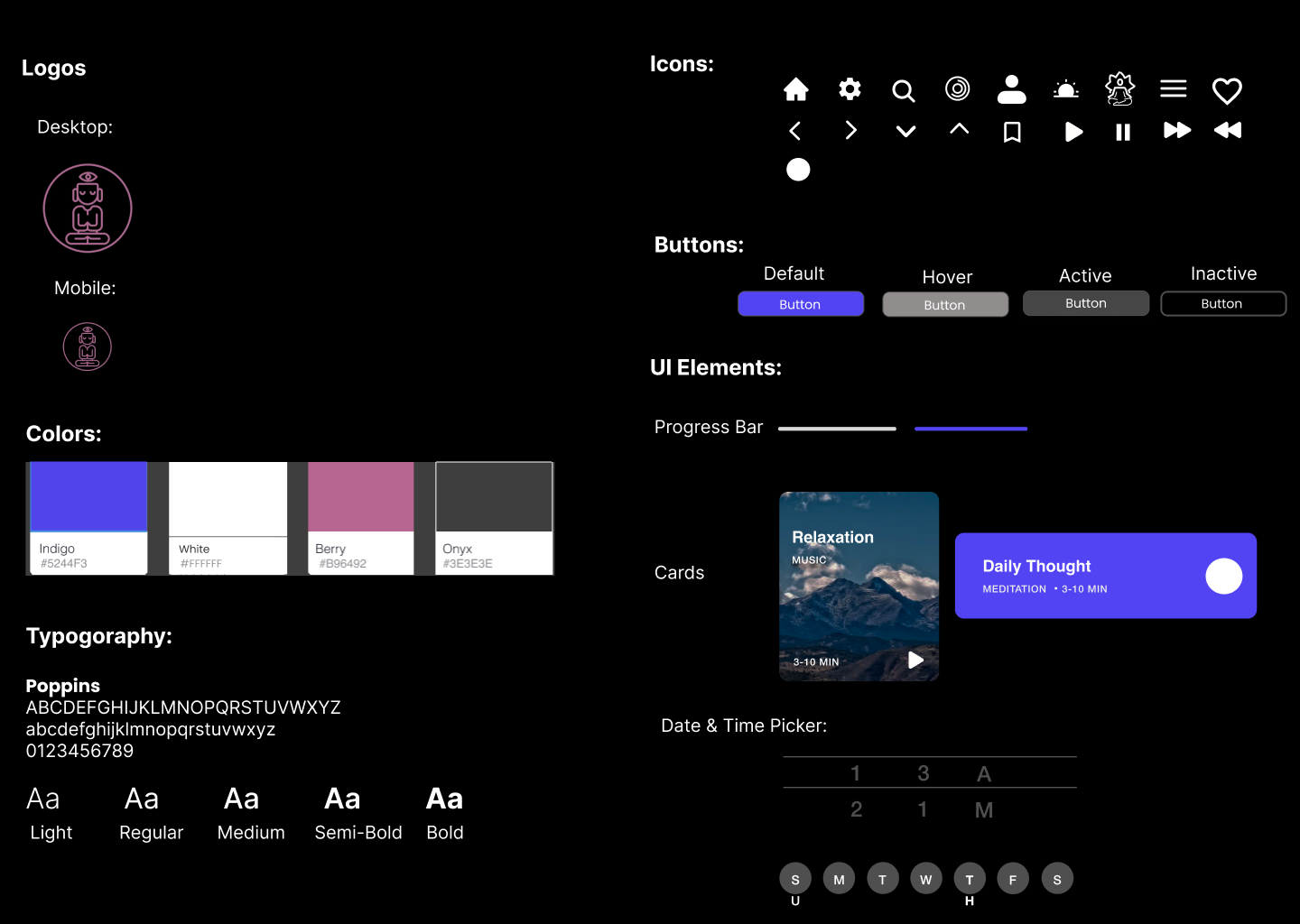 The choice of indigo as the primary style was deliberate, symbolizing the third-eye chakra and intuitive energy while fostering focus. Placing indigo on a dark background not only creates a visually striking contrast but also reduces strain on the user's eyes. Furthermore, the UI elements were designed to be familiar, ensuring cohesive and inclusive iconography for all user demographics.
