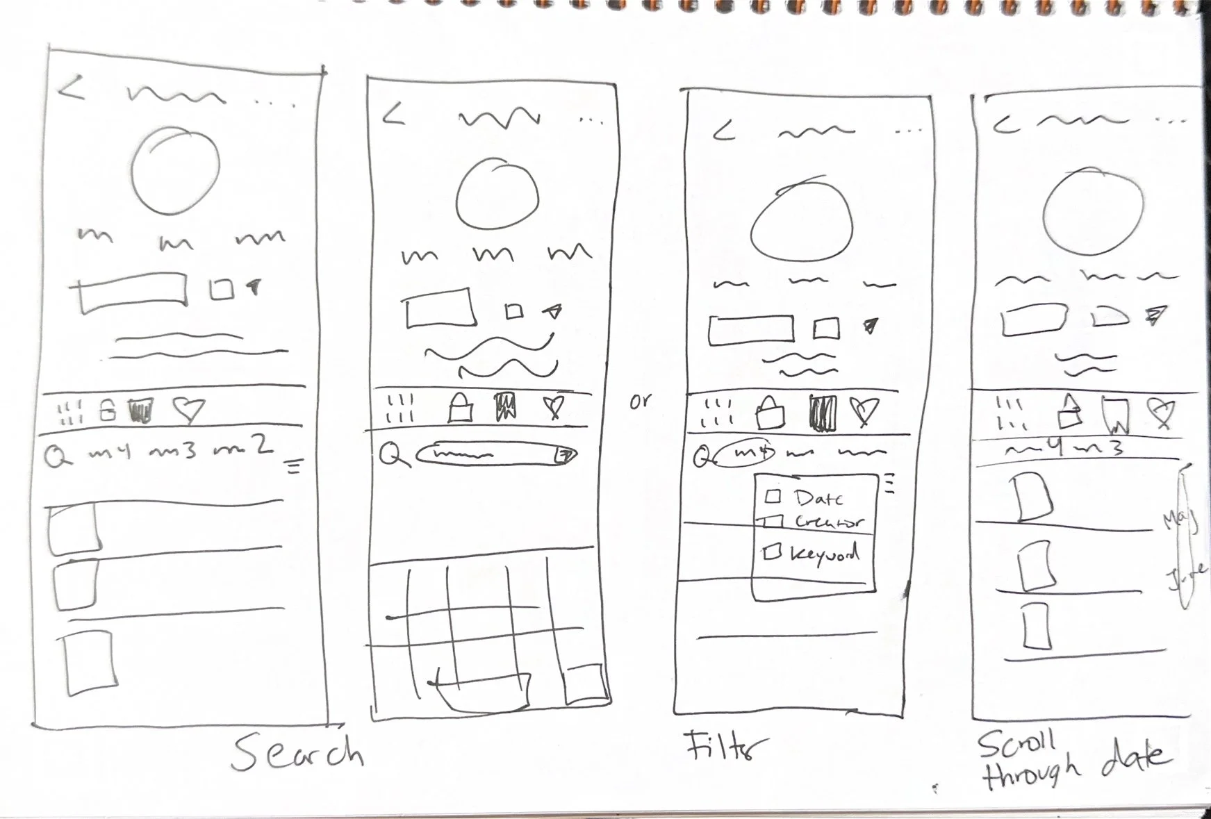 I began creating my designs with a Low-Fidelity Wireframe. I started by sketching my feature ideas until I could narrow down a specific feel or look that I liked.